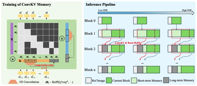 与此同时,ConvKV Memory对历史信息进行了分层处理:短期记忆保留高精度信息,以保证局部细节与连续性;长期记忆则通过轻量卷积进行压缩,把历史信息压缩进固定长度表示。这种“精确+压缩”的组合方式,使模型在维持全局一致性的同时避免显存无限增长。此外,模型还通过RoPE Reset机制对位置编码进行对齐,进一步缓解长序列中的位置漂移问题。