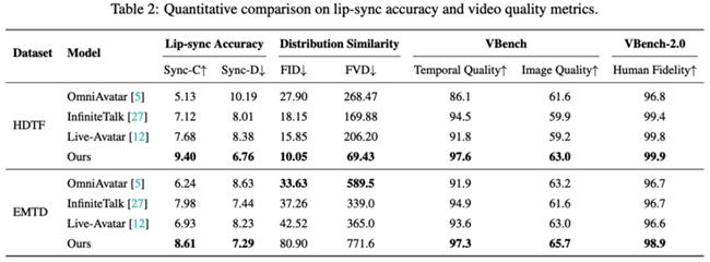 从评测结果来看,SoulX-LiveAct在多个指标上体现出较为均衡的表现。在HDTF数据集上,其Sync-C达到9.40,Sync-D为6.76,同时在分布相似性指标上达到10.05 FID与69.43 FVD,并在VBench中取得97.6的Temporal Quality与63.0的Image Quality,VBench-2.0中的Human Fidelity达到99.9。在EMTD数据集上,其Sync-C为8.61,Sync-D为7.29,同时在VBench中达到97.3的Temporal Quality与65.7的Image Quality,Human Fidelity为98.9。这些结果反映出模型在口型同步、动作表达以及整体一致性方面的综合能力。